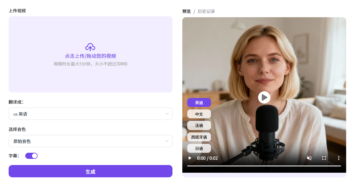 - 唇形同步:当前主打“配音+翻译”的声线迁移,并不包含自动口型同步能力;如果你的项目对嘴型要求高,需要另配唇形工具或接受无唇形版本。